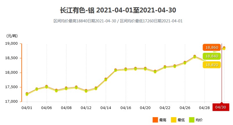 我們先來4月份長江有色鋁錠價,真的是“漲勢喜人”啊。從月初讓人不能接受的過一萬七的高價,到月底已經(jīng)讓人麻木的沖一萬九的史無前例的價格。是世界…