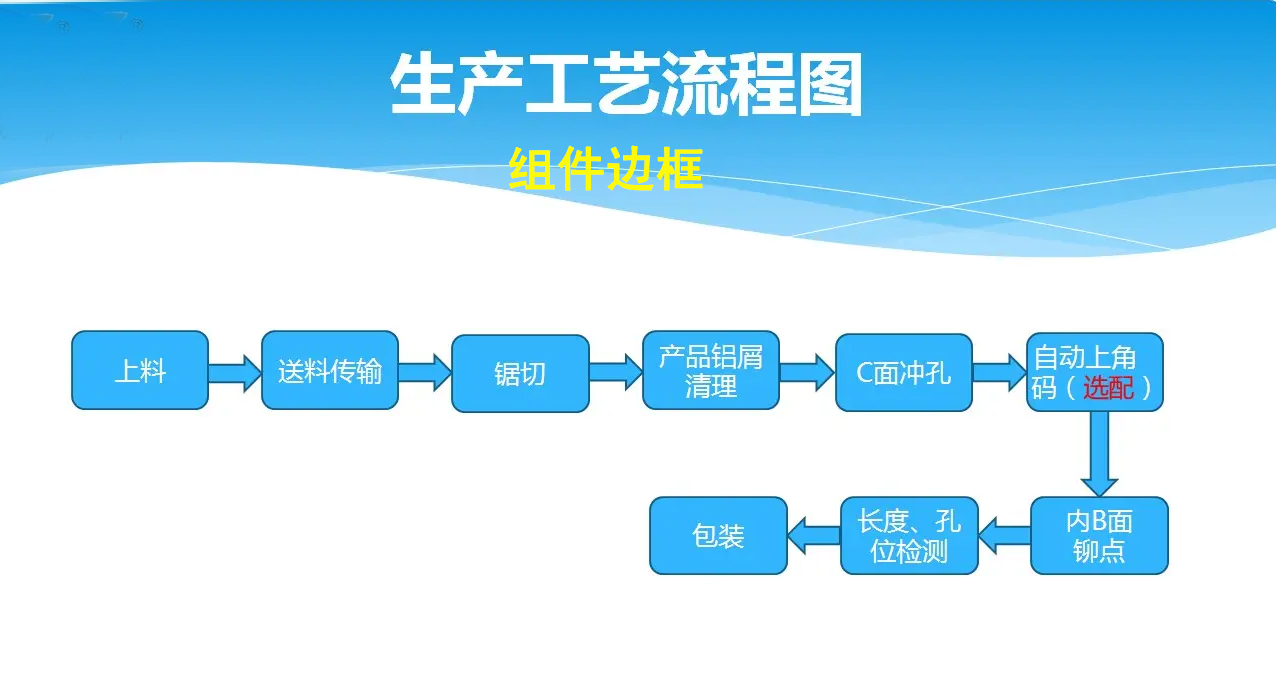 這是全自動生產(chǎn)線的加工工藝流程,只有上料和包裝這兩個流程是需要人工操作的,中間的過程都是自動線完成的。因為光伏邊框產(chǎn)量比較大,自動線可以有效的節(jié)約人力成本,提高生產(chǎn)效率。