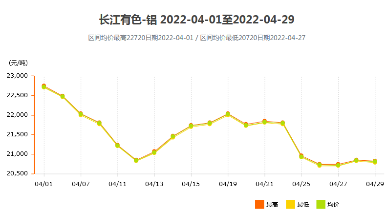 四月鋁錠價整體是下降的狀態(tài),從41日開始鋁錠價就蹭蹭往下掉,一直到12號開始觸底反彈,但也沒有彈的很厲害。12天長江有色鋁價跌了1880元。到四月中旬保持在21700元左右,月底又猛跌一下,跌破21000,好在最后幾天兜住了,沒有一瀉千里。四月鋁錠價最低20720,最高22720,相差整整2000元。
